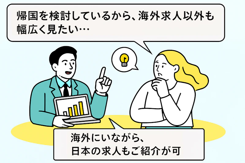 海外から日本国内の求人や海外駐在求人のご紹介、また面接対策・オファー内容の交渉まで、一貫したご転職サポートをご提供します。